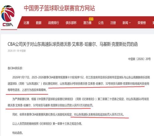 针对此事,CBA公司在赛后,也是进行了调查,确定山东队德沃恩·艾库恩-珀塞尔、马基斯·克里斯对当值裁判使用了侮辱性语言,他们的这种行为,严重违反了体育精神。因此,根据CBA联赛的相关规则,对德沃恩·艾库恩-珀塞尔、马基斯·克里斯两人分别罚款30000元。