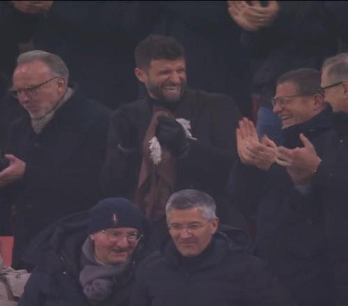 身份升级穆勒与埃贝尔同坐看台,欢笑庆祝卡尔进球 -